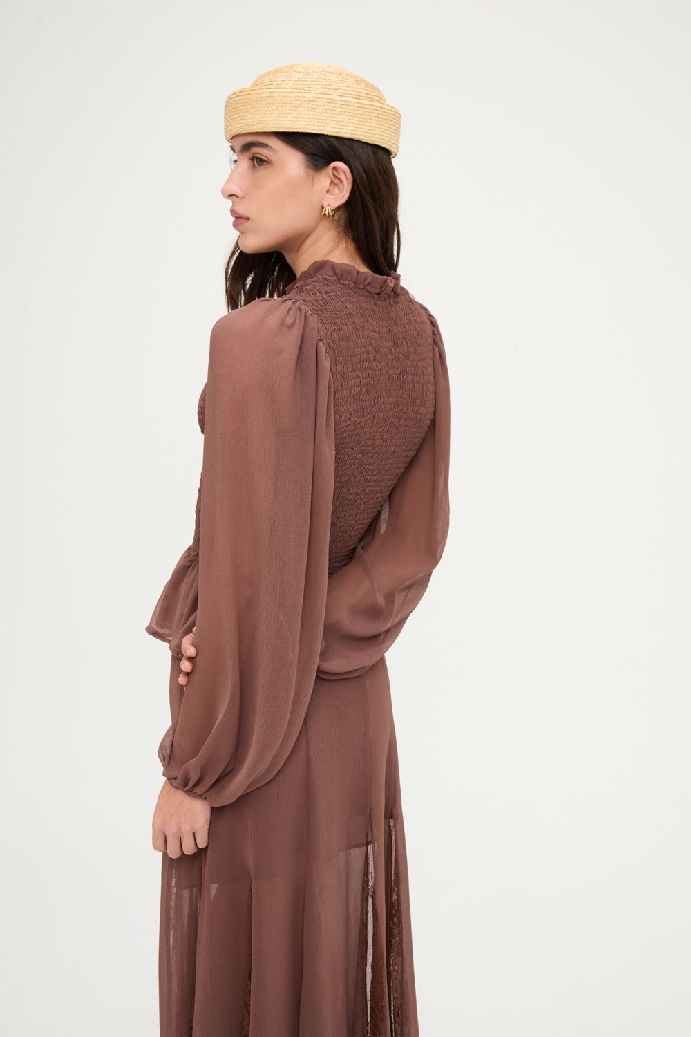 Blouse made of ivory chiffon, high neck with back button fastening, detachable ruffled cuff, and button closure.