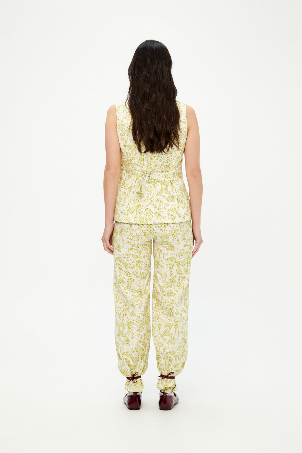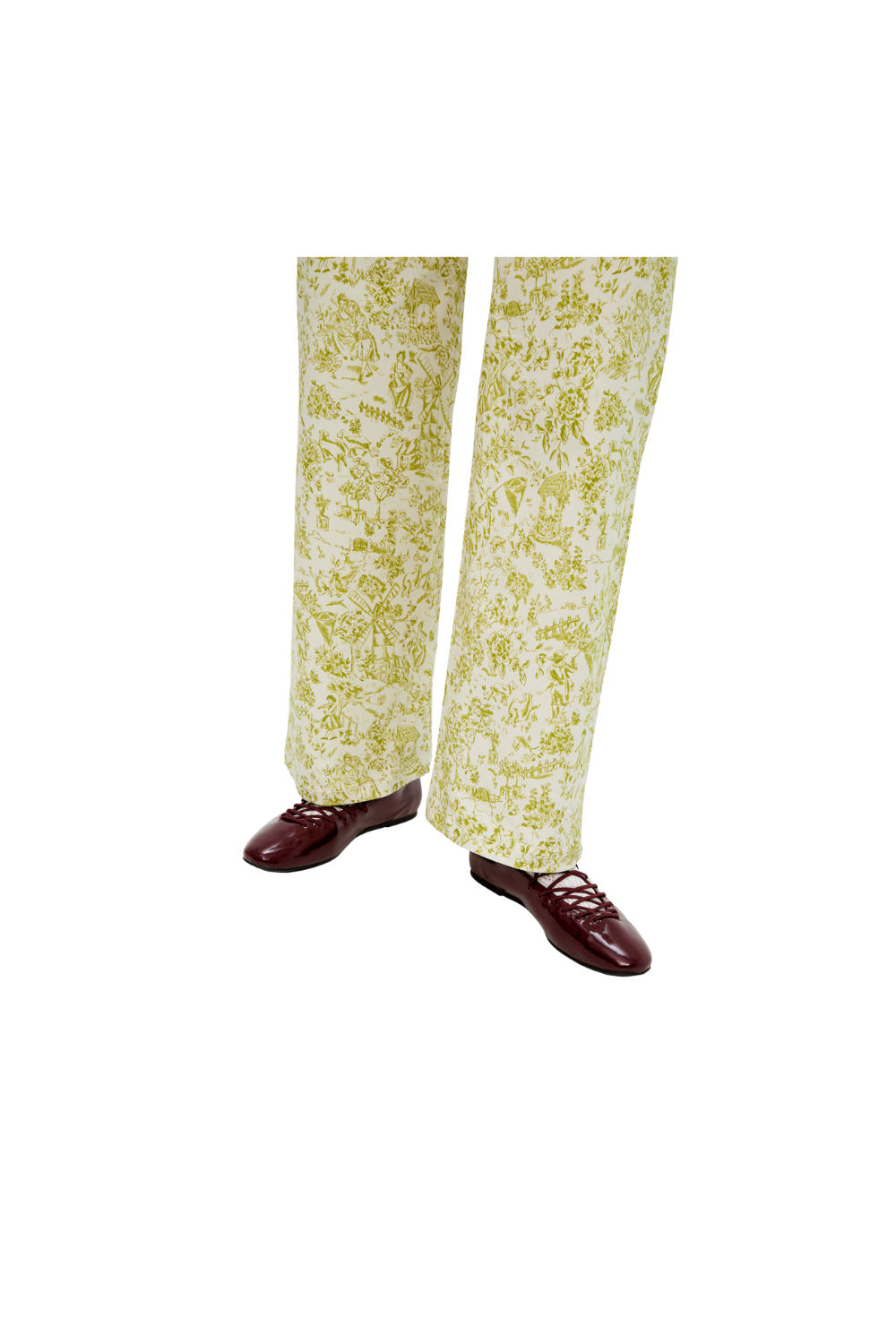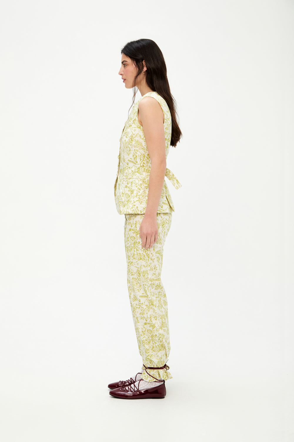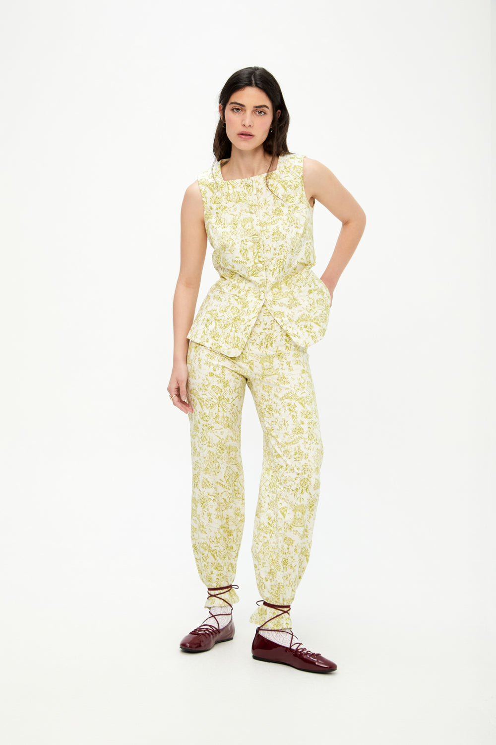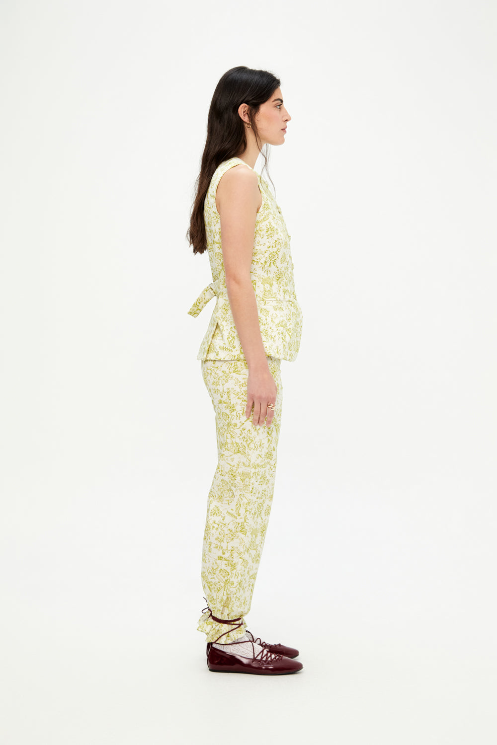 Pantalón confeccionado en tejido e algodón Toile de Jouy verde, cierre con cremallera frontal y botón forrado.