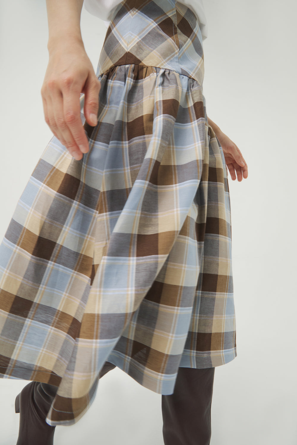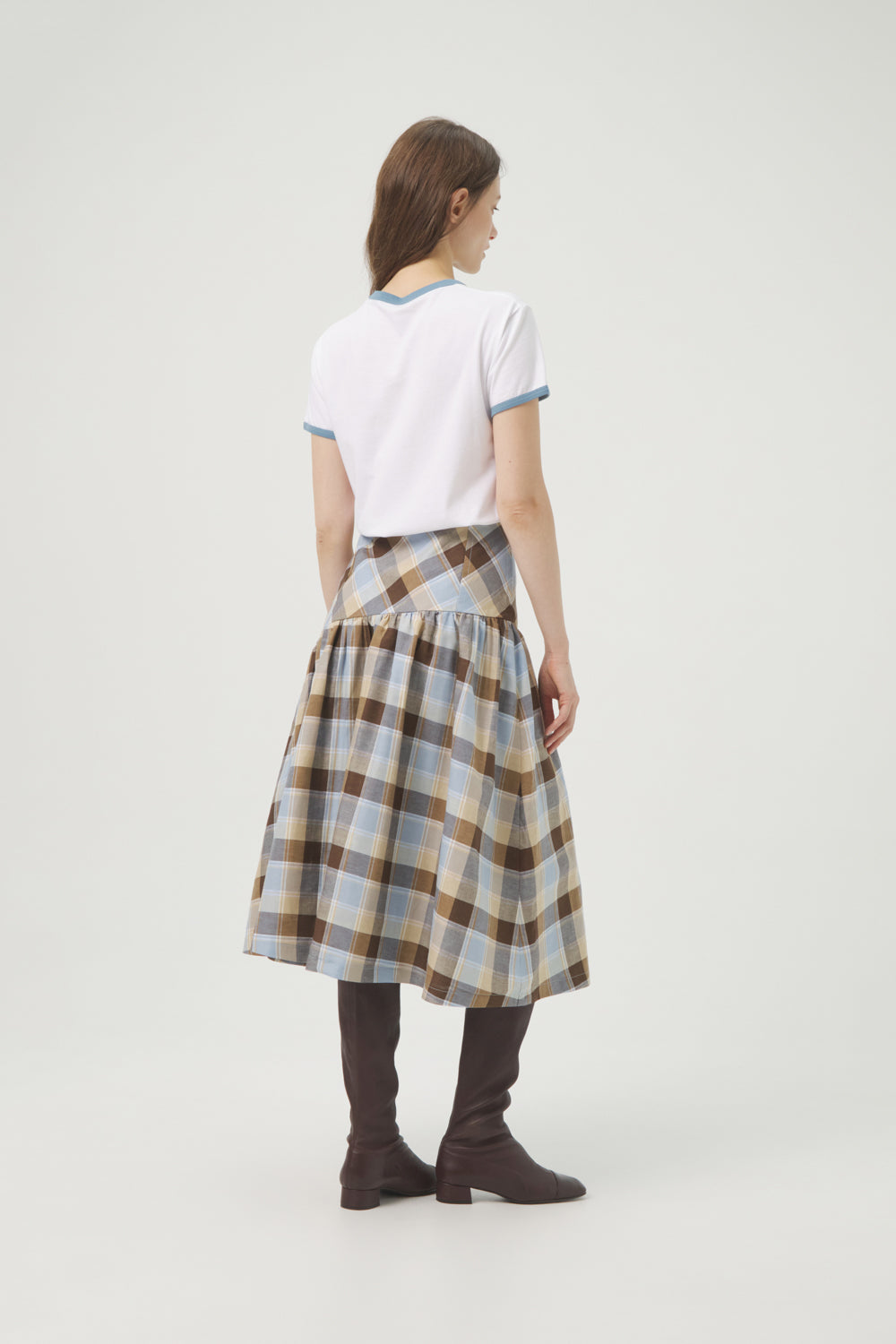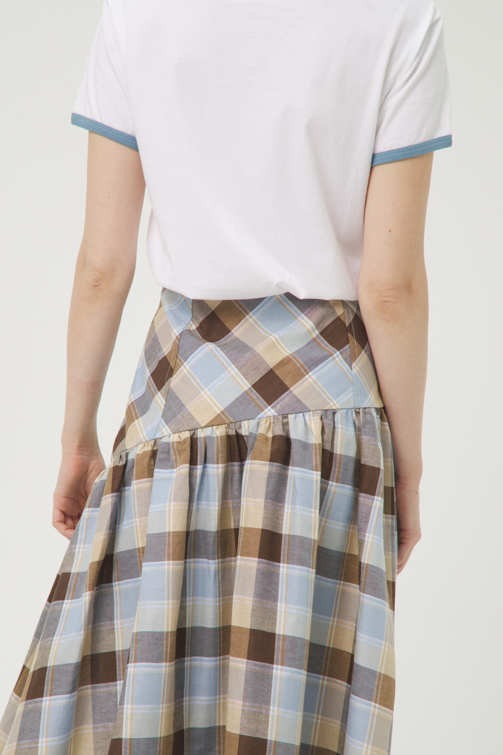 Falda midi con vuelo y cuerpo asimétrico cortado al biés confeccionada en tejido recuperado oxford de cuadros en lino y algodón.