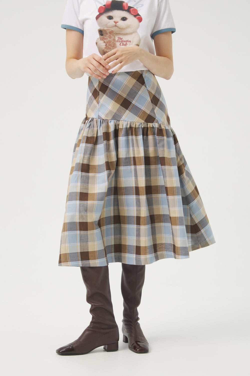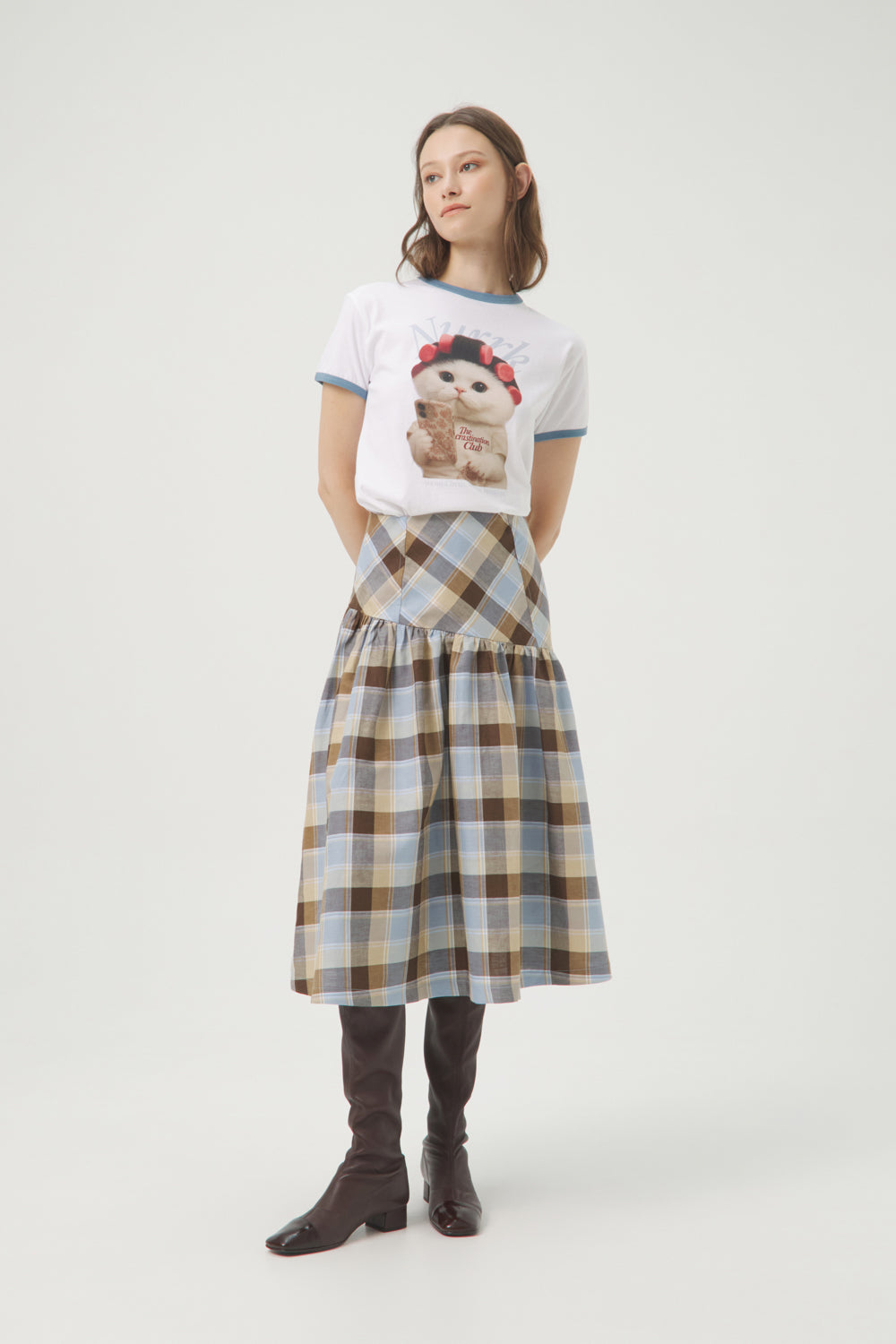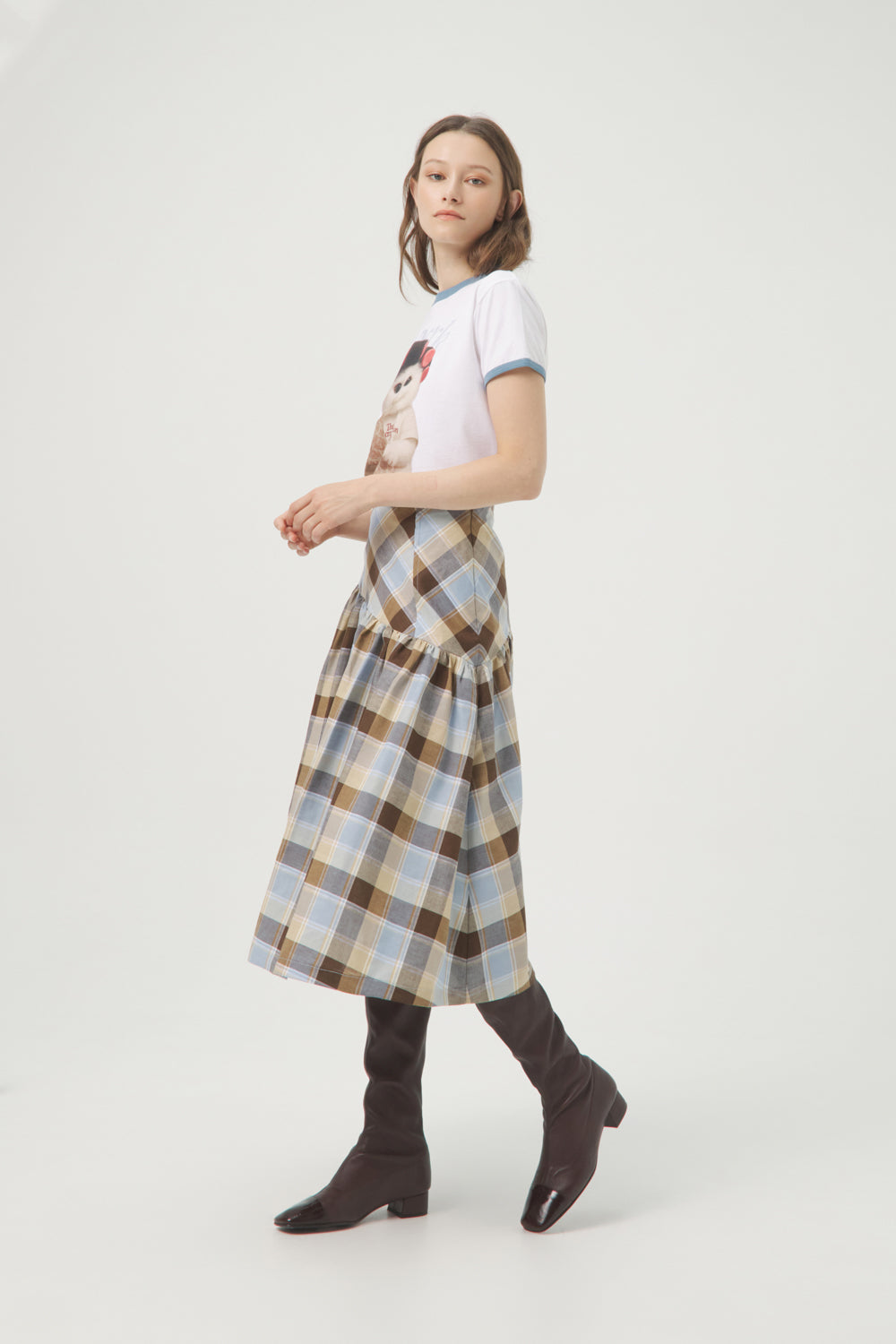 Falda midi con vuelo y cuerpo asimétrico cortado al biés confeccionada en tejido recuperado oxford de cuadros en lino y algodón.