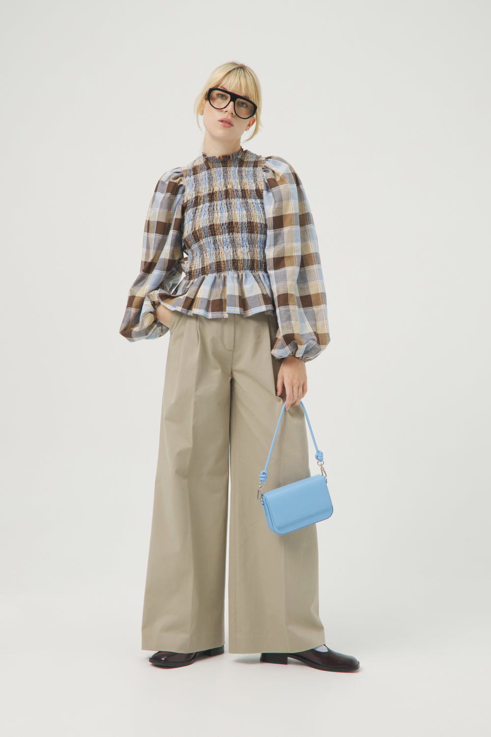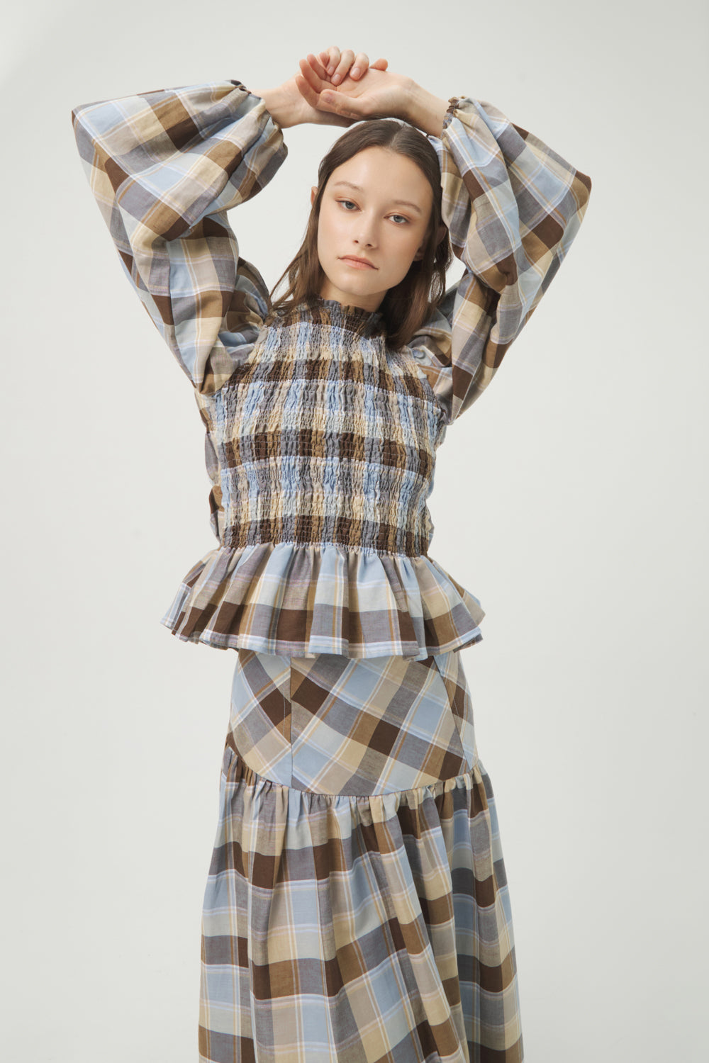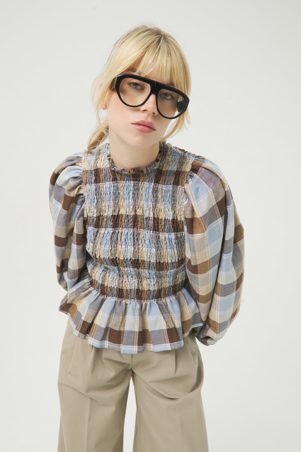 Top engomado con corte peplum a la cintura y mangas abullonadas confeccionado en tejido recuperado oxford de cuadros en lino y algodón.