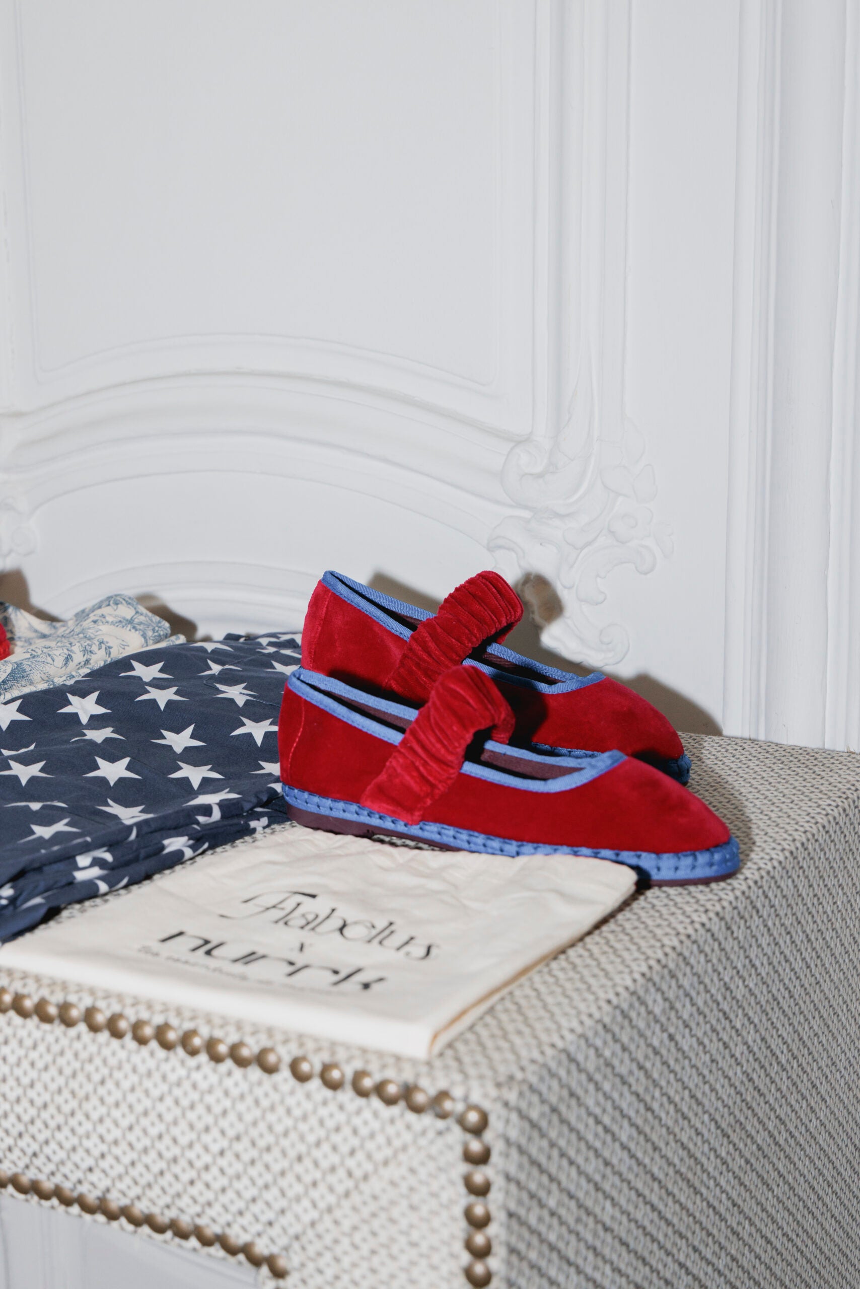 PRODUCTO OUTLET * - Mafalda de terciopelo en color rojo con ribetes en azul y elástico de terciopelo rojo a juego. Se recomienda comprar una talla más de la habitual.