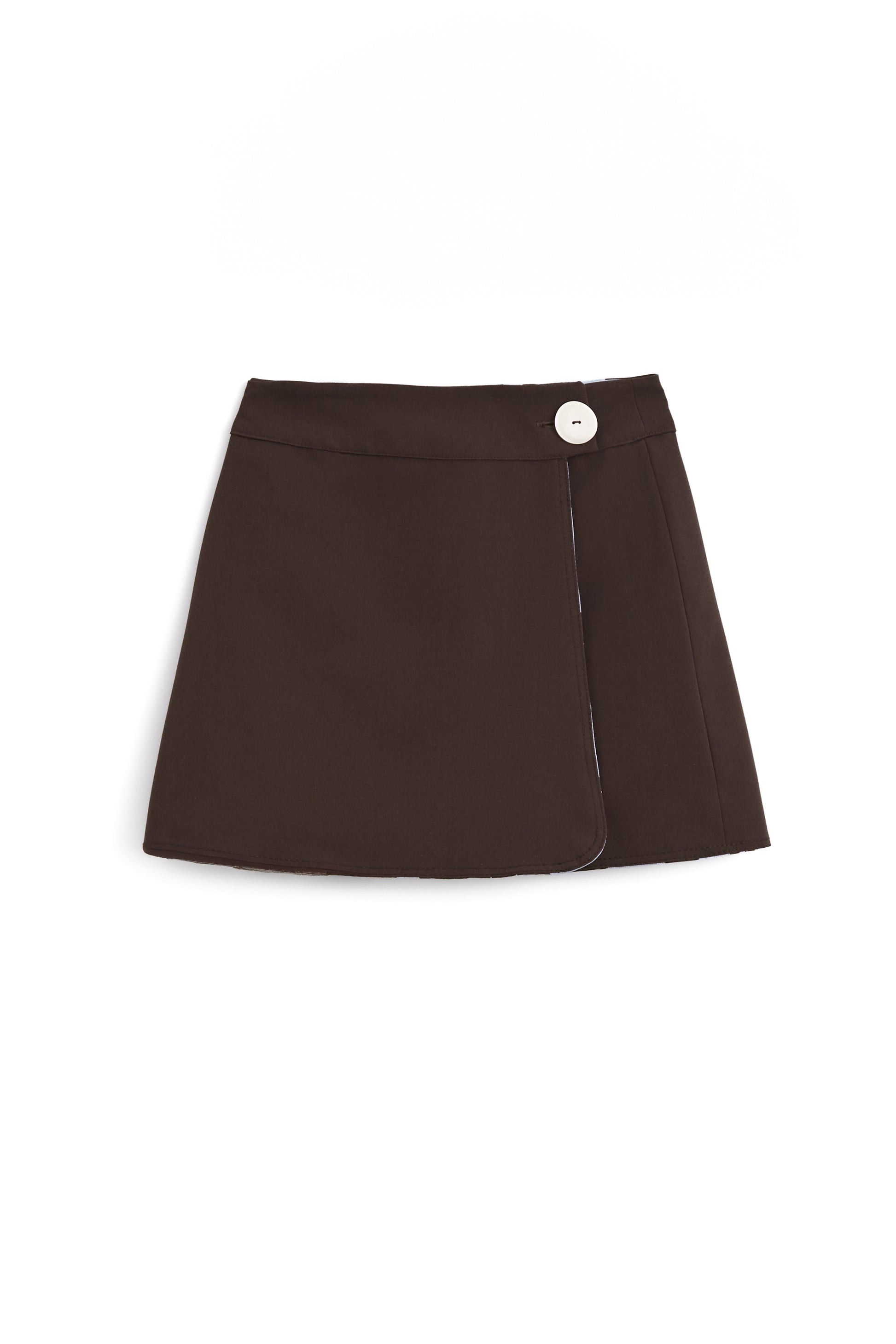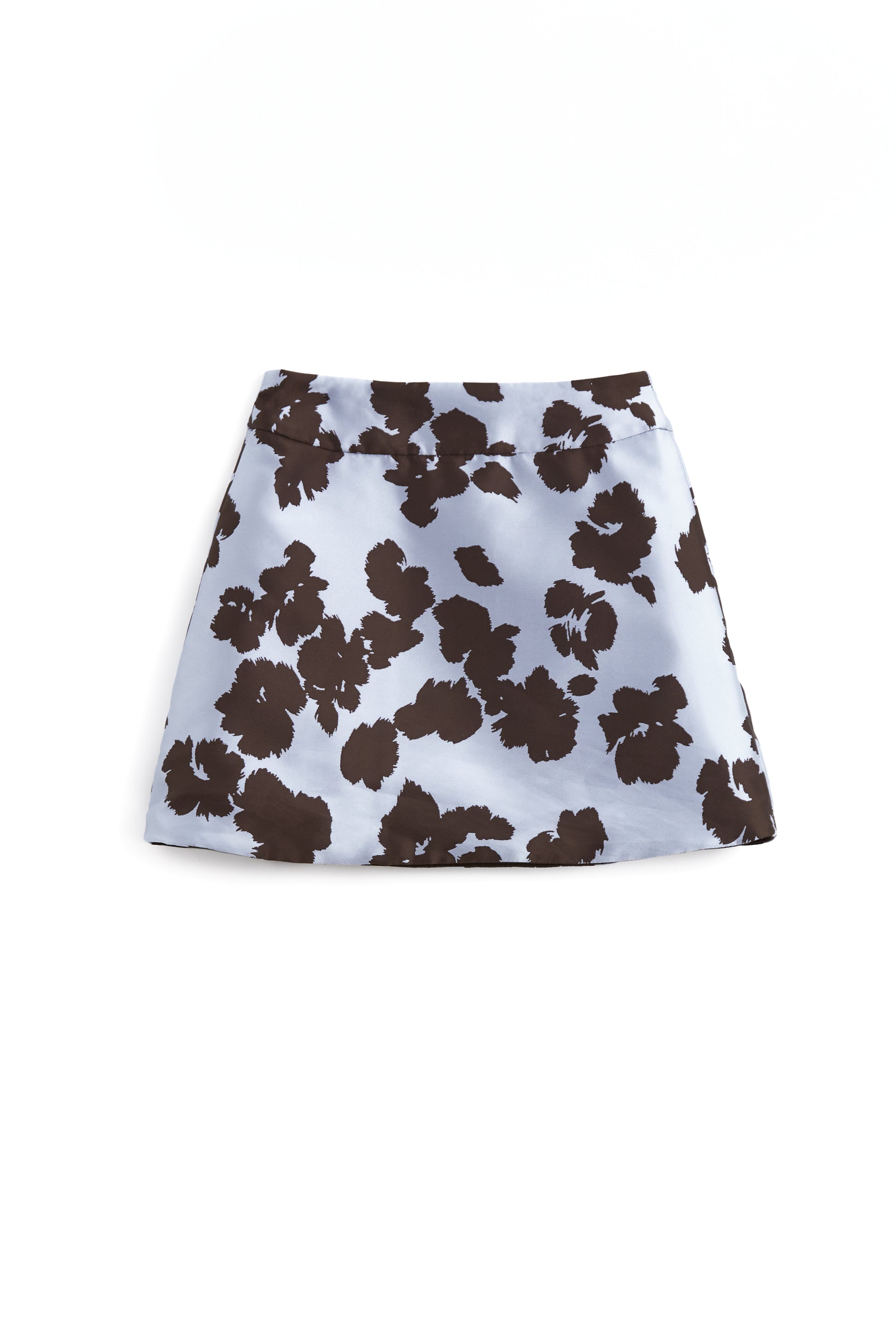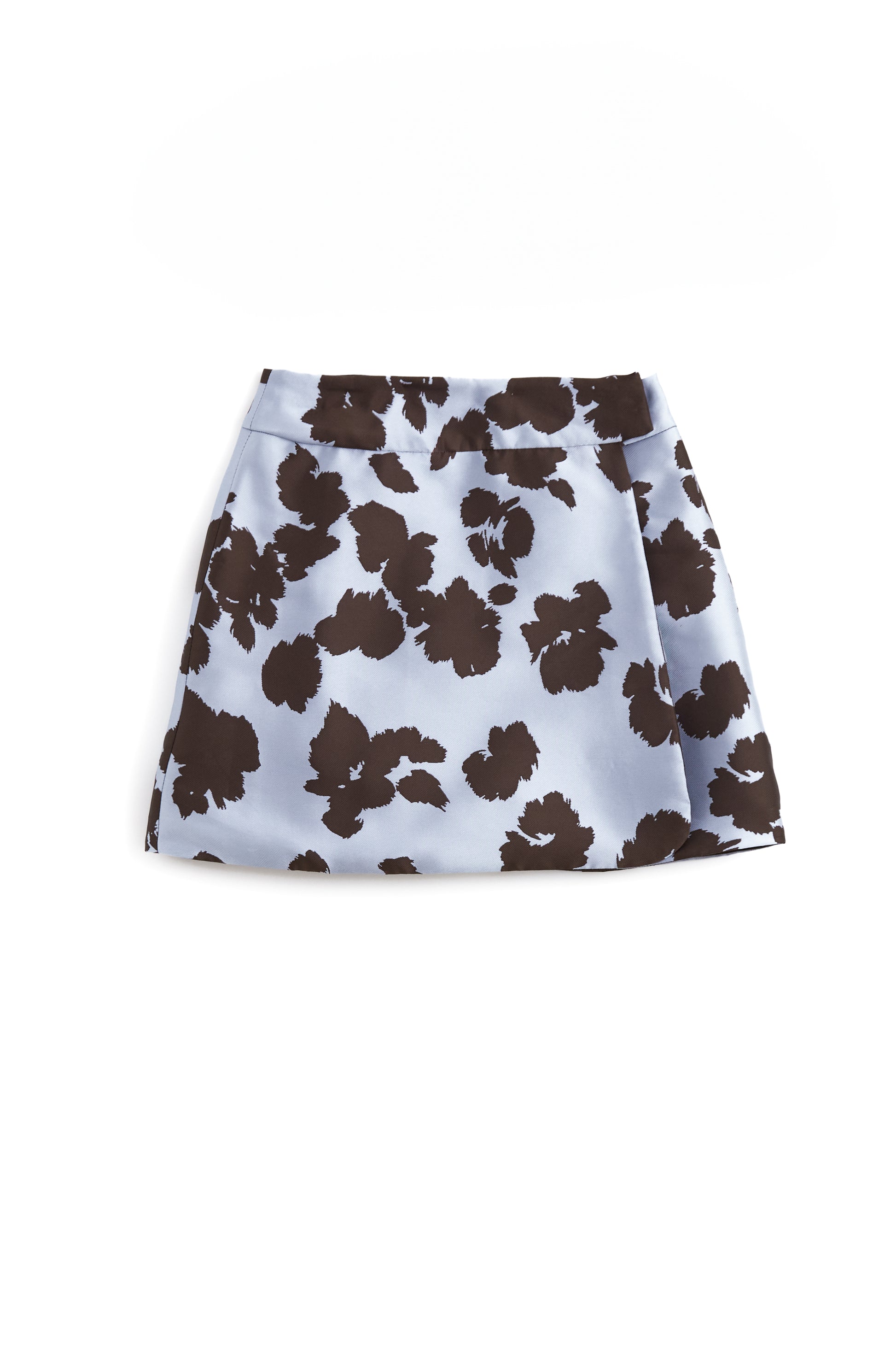 Falda cruzada reversible de edición limitada diseñada en colaboración con Andi Washington. La cara exterior esta confeccionada en un jacquard floral de acabado satinado y la cara interior en una sarga de color chocolate.