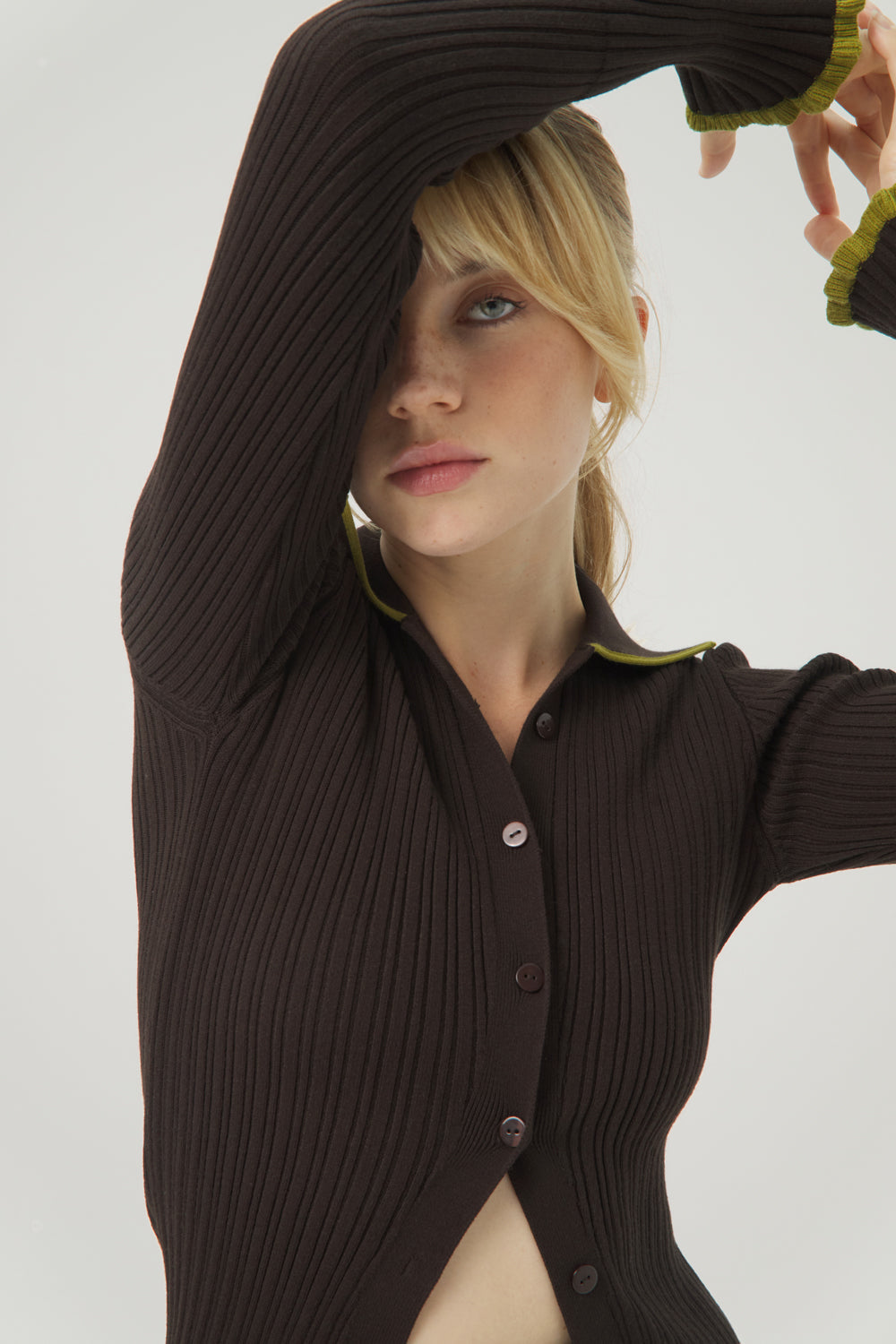 Chaqueta de canalé con cuello camisero y bordes en hilo a contraste.