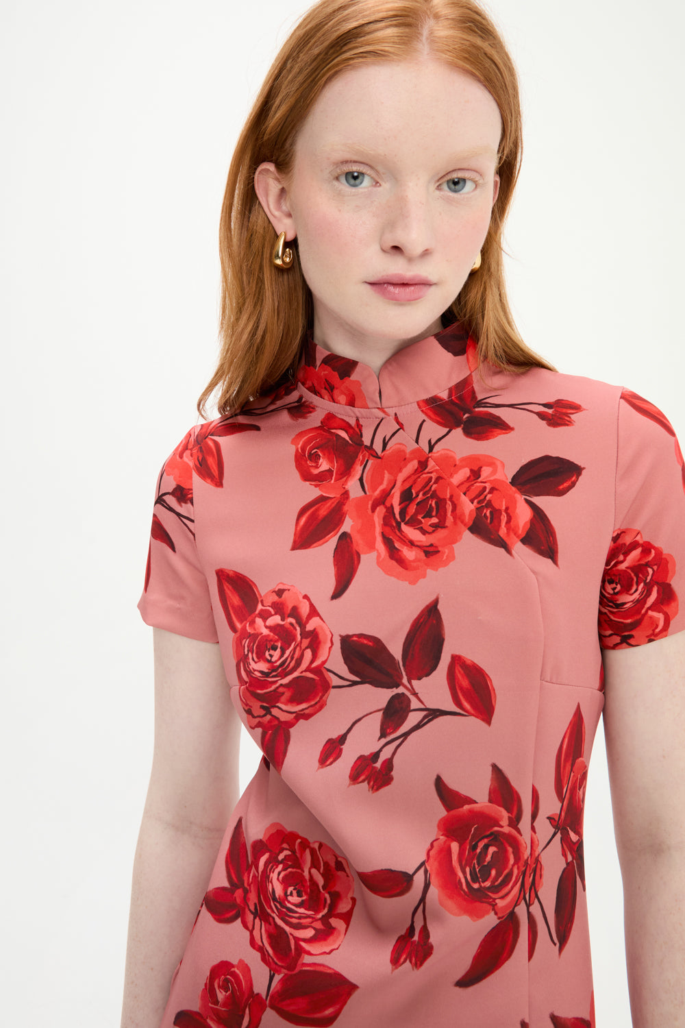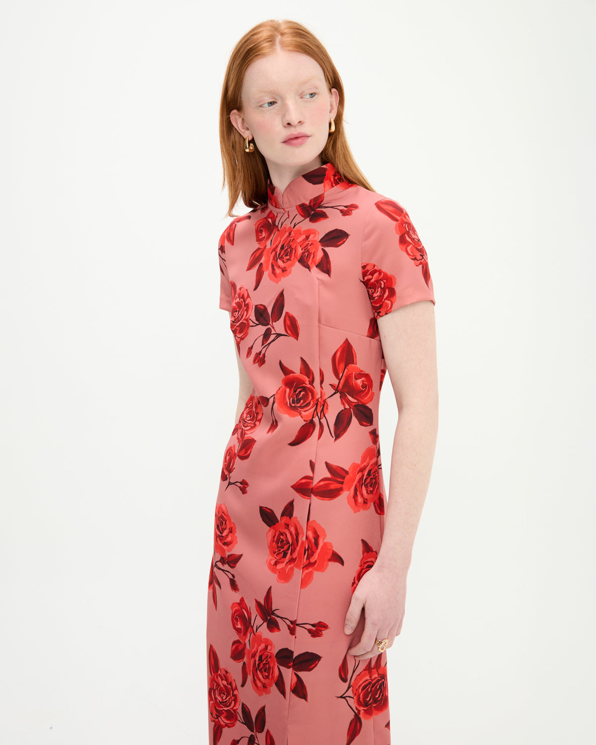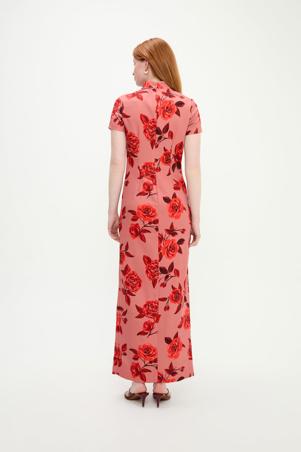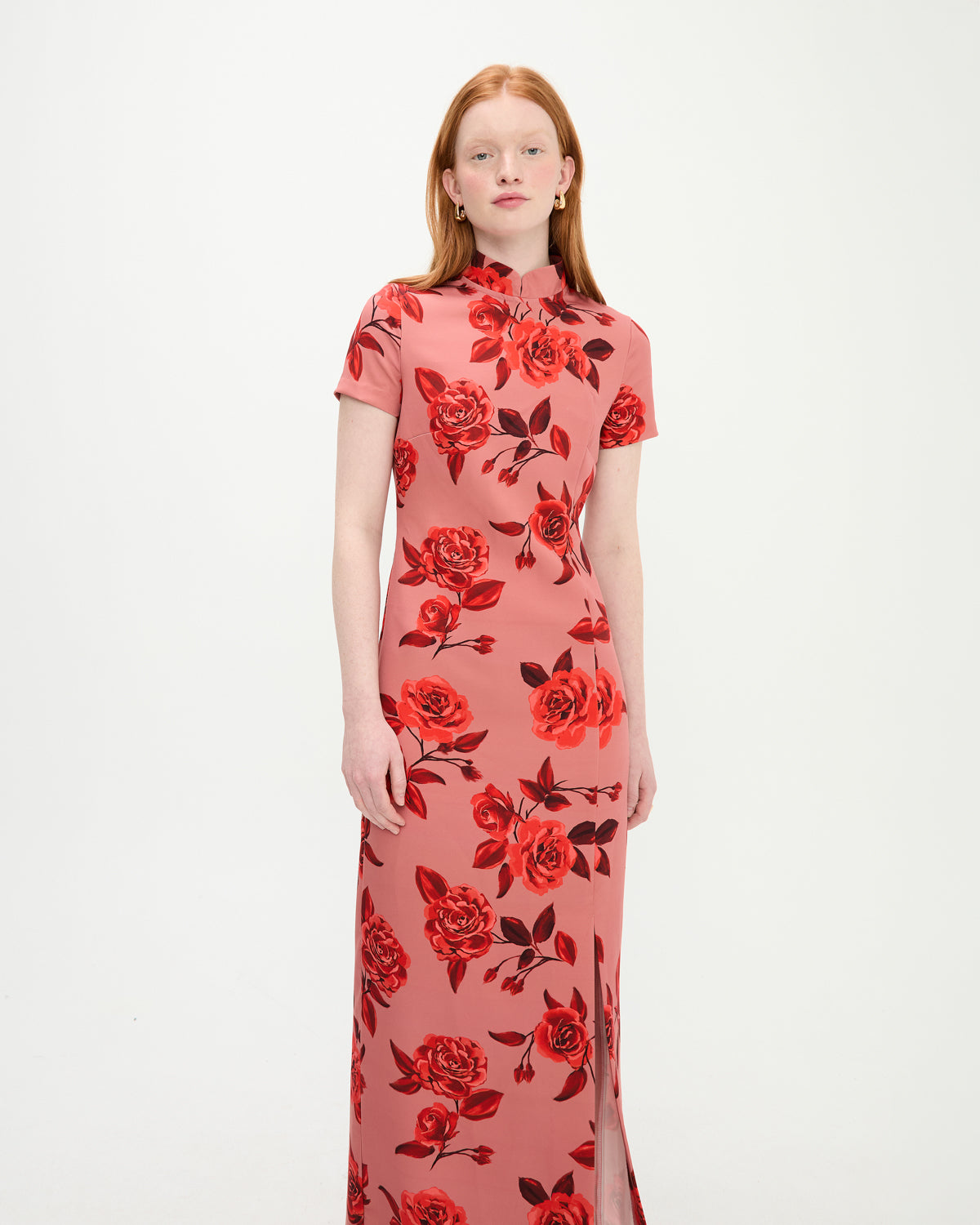 Vestido largo de cuello mao de corte entallado con abertura lateral, confeccionado en tejido poliéster con elastano.